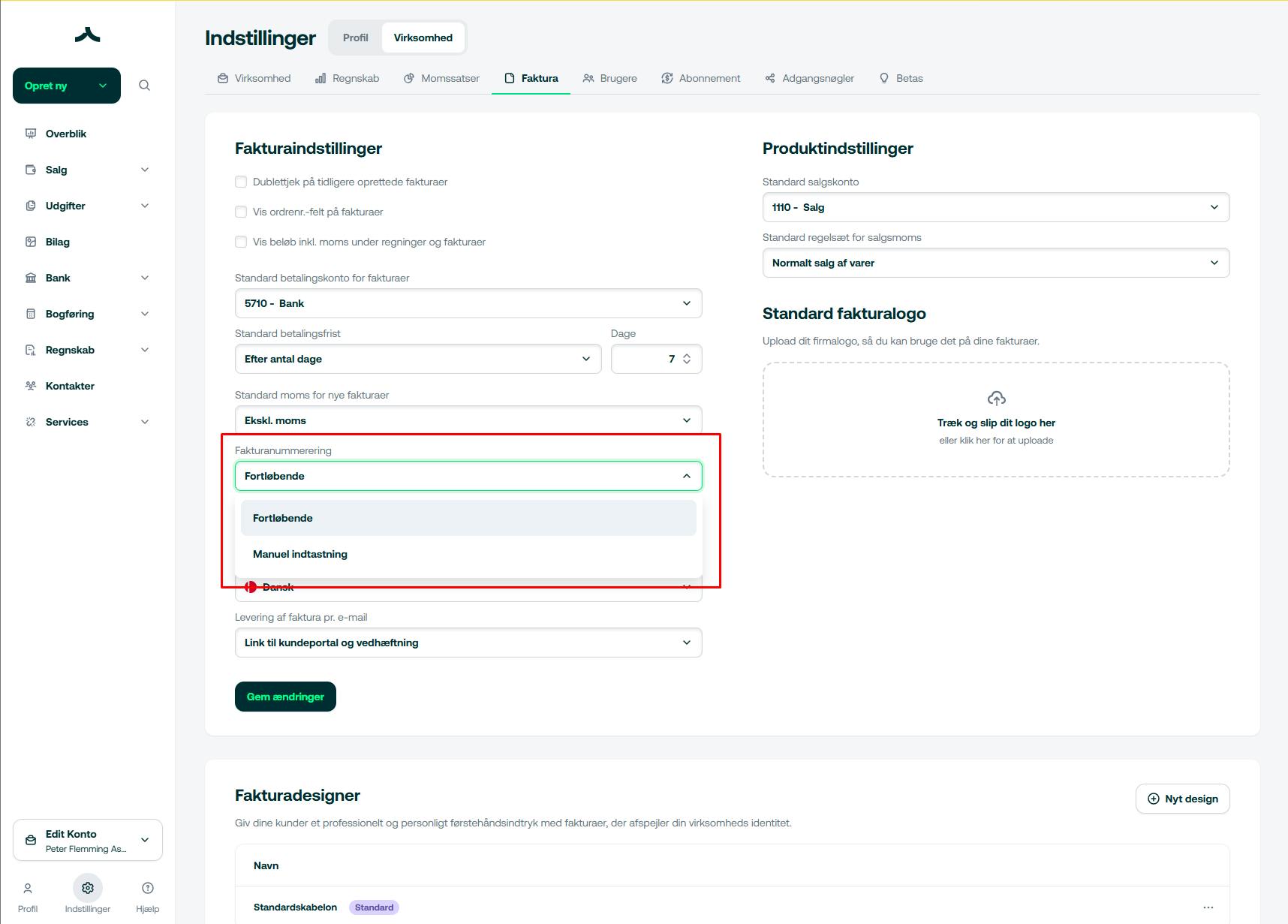 - Du kan indstille dine fakturanumre til at være fortløbende eller om de skal indtastet manuelt i samme indstillingsside.