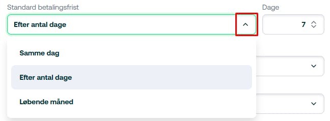 - Klik på drop-down for at ændre dine standard betalingsbetingelser