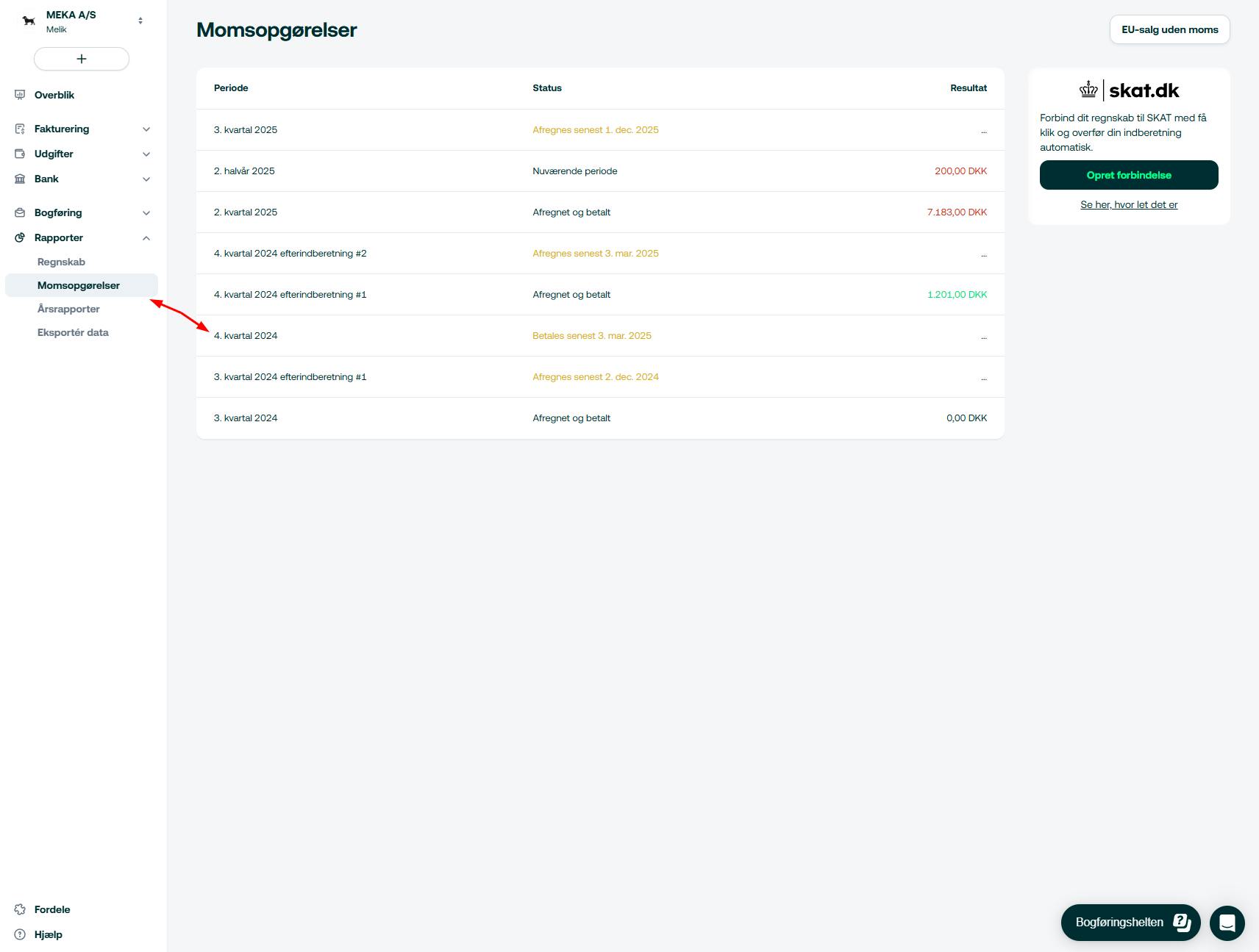 - Klik på den pågældende momsopgørelse. Vi bruger 4. kvartal 2024 som eksempel