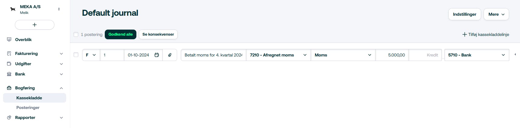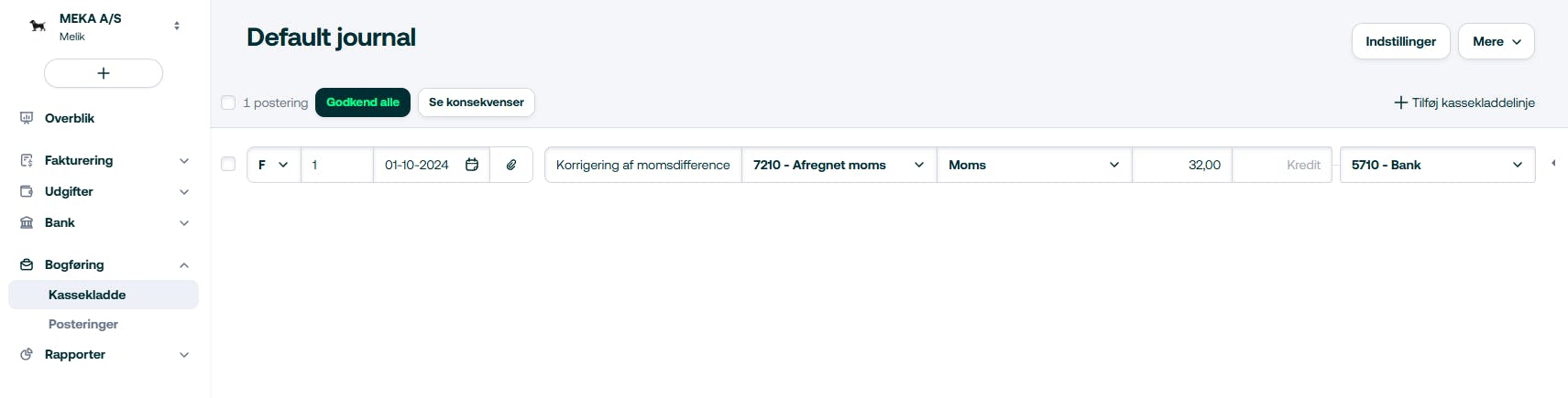 Her har du altså først afregnet og registreret betalingen direkte i momsopgørelsen for efterfølgende at bogføre differencen manuelt i kassekladden.