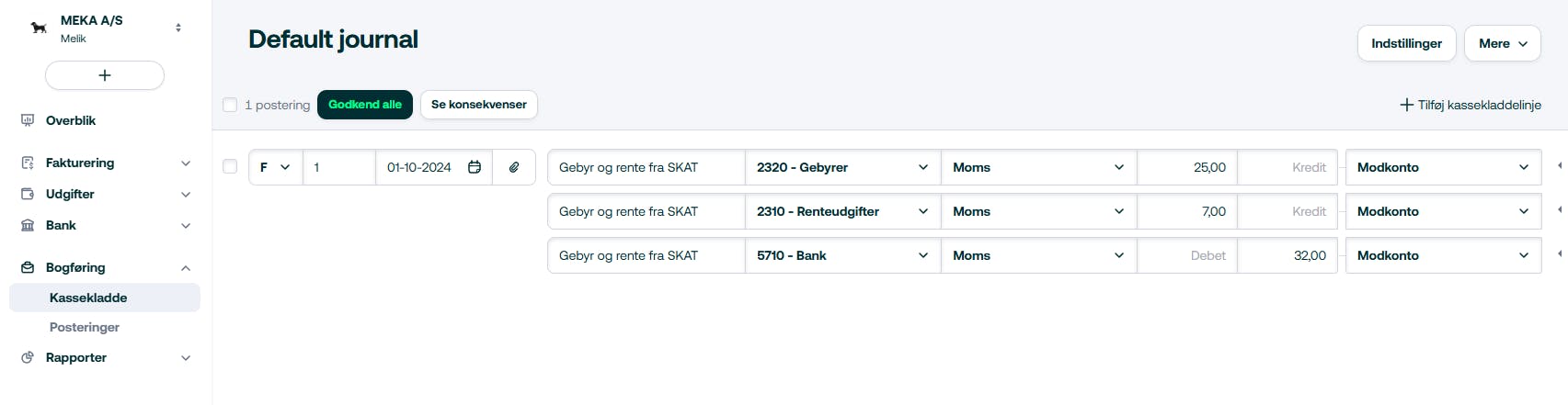 Hvis du ved at denne differencen faktisk skyldes nogle gebyrer og/eller renteudgifter fra SKAT, kan du i stedet for bogføre det med denne kassekladde i stedet for: