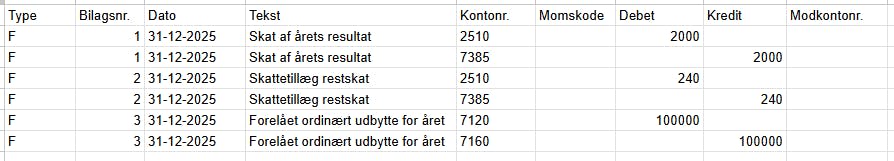 Eksemplet viser bogføringen af årets skat, skattetillæg fra restskat samt foreslået udbytte. CSV-filen importeres til kassekladden således: