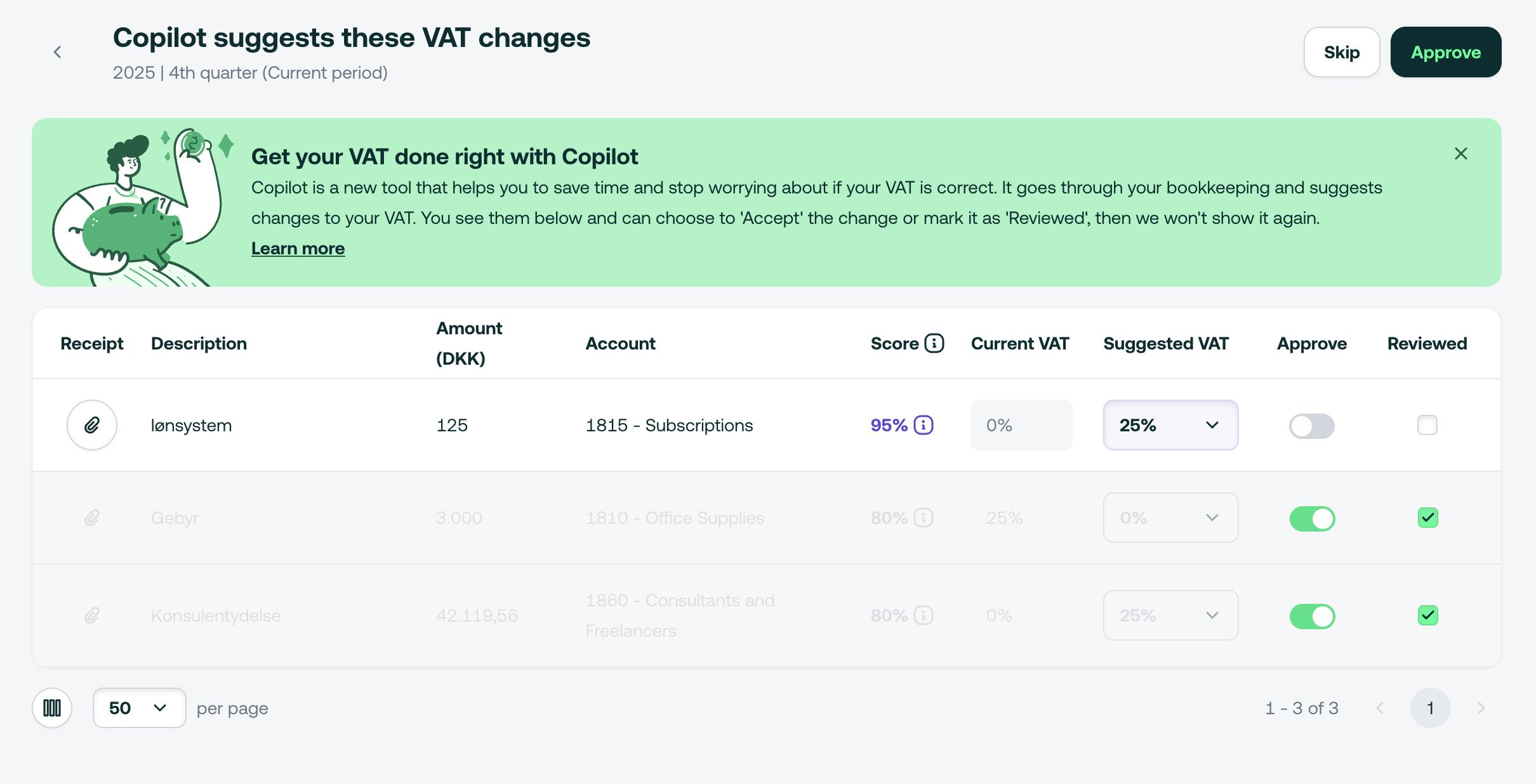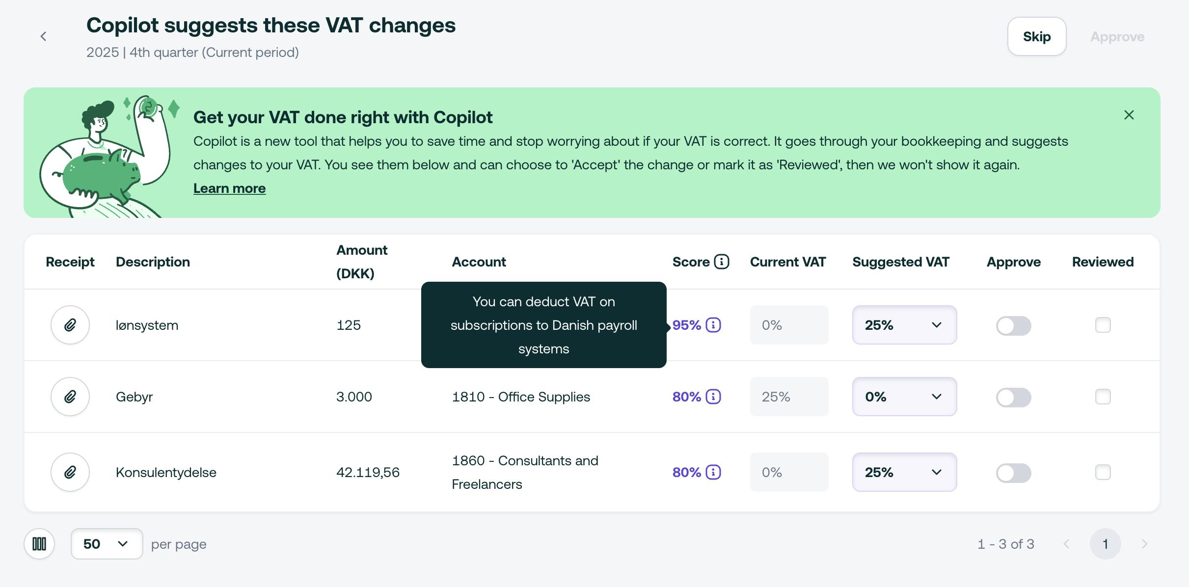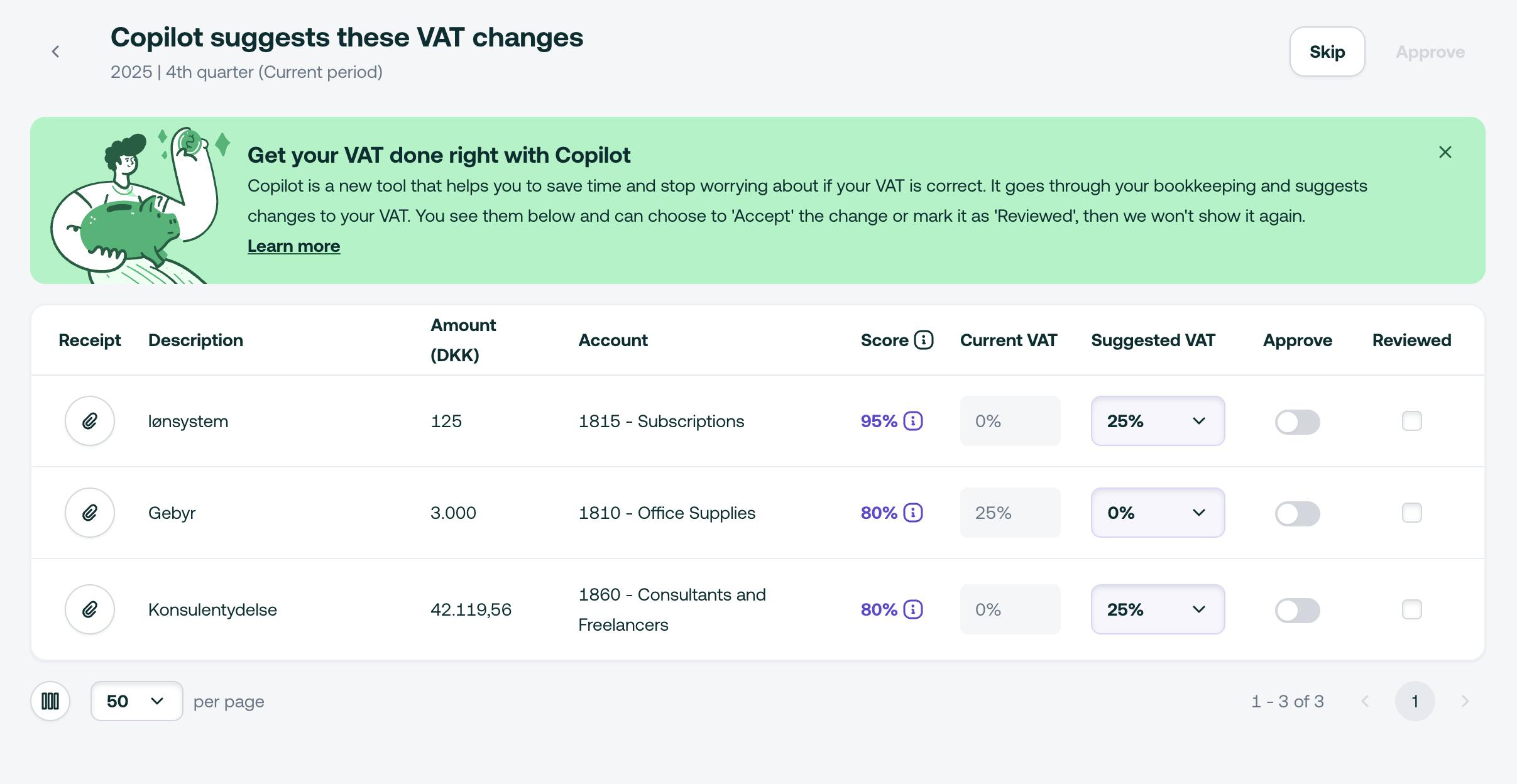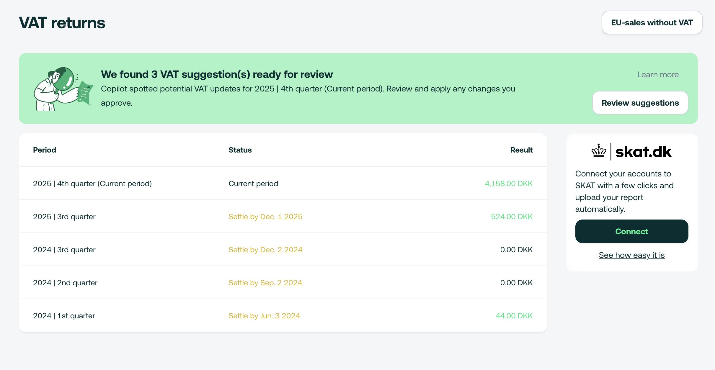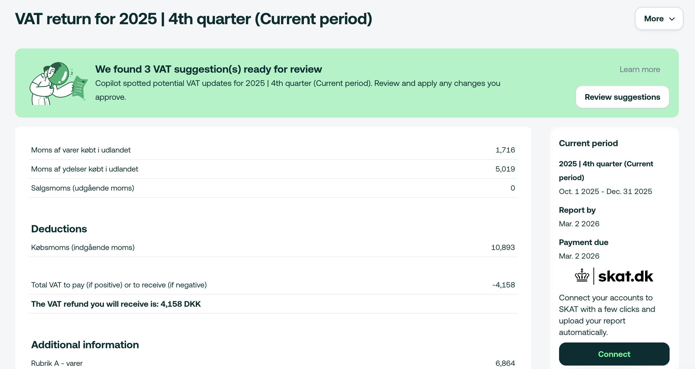 Når du går ind i din momsopgørelse, scanner Copilot automatisk dine posteringer og leder efter steder din moms bør ændres. Det kan fx være:
