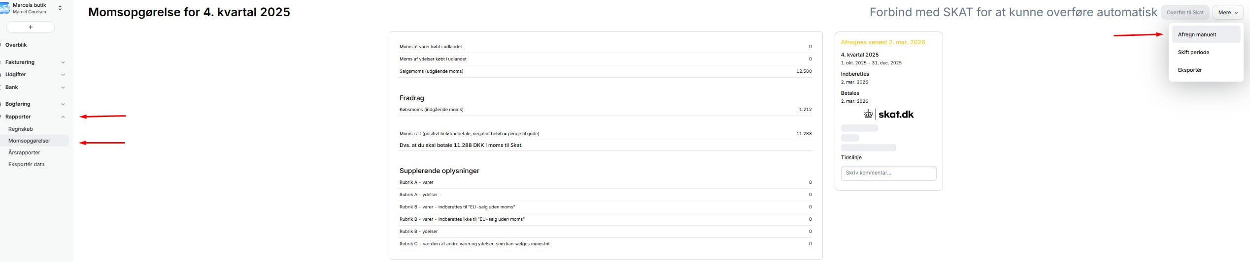Hvis du er over deadline for indberetningen skal du manuelt indberette momsen på SKATs side og kan ikke bruge vores integration.