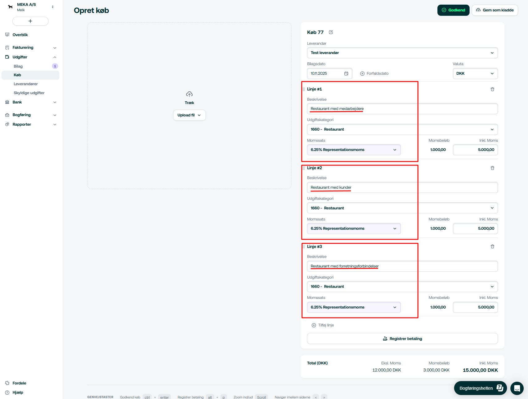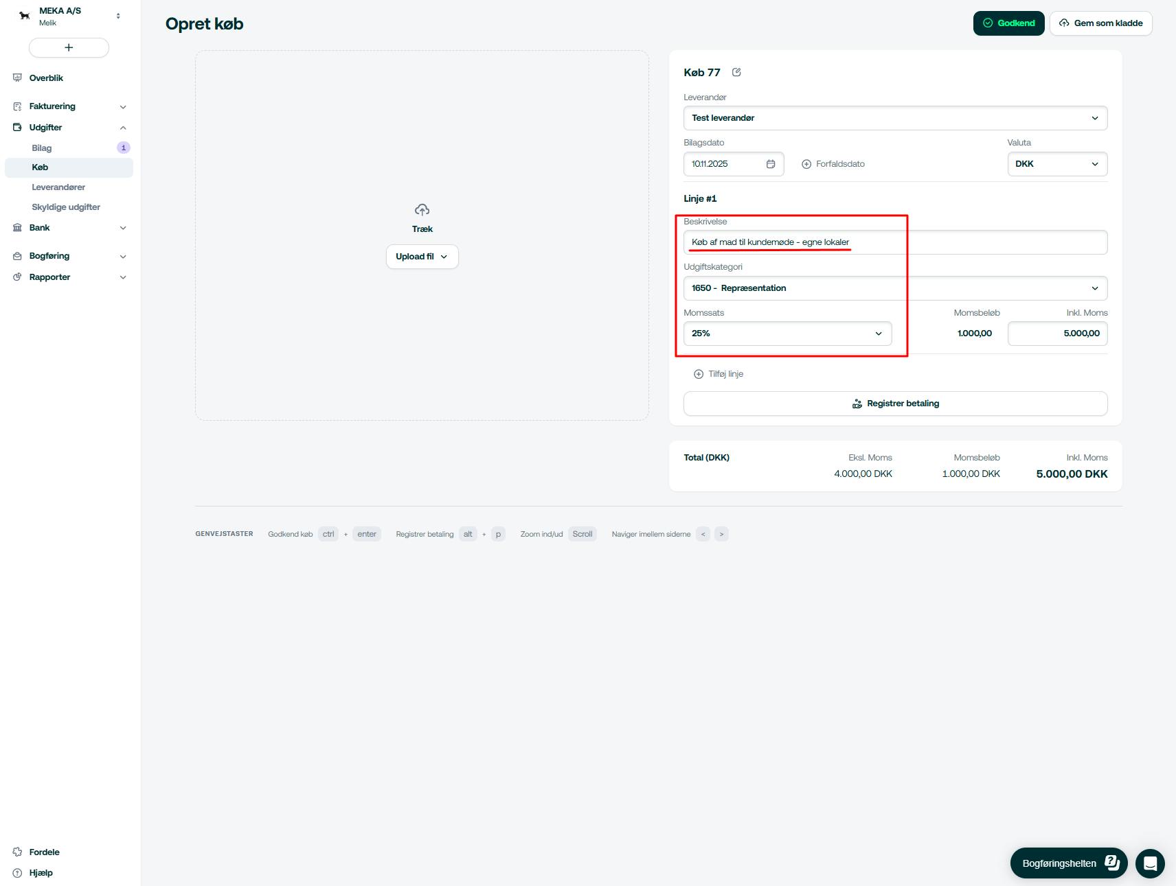 - Vælg udgiftskategorien 1660 - Restaurant og vælg momssatsen (25%) Repræsentationsmoms (ved at vælge denne momssats, bogfører systemet automatisk kun det kvarte af momsbeløbet som købsmoms)