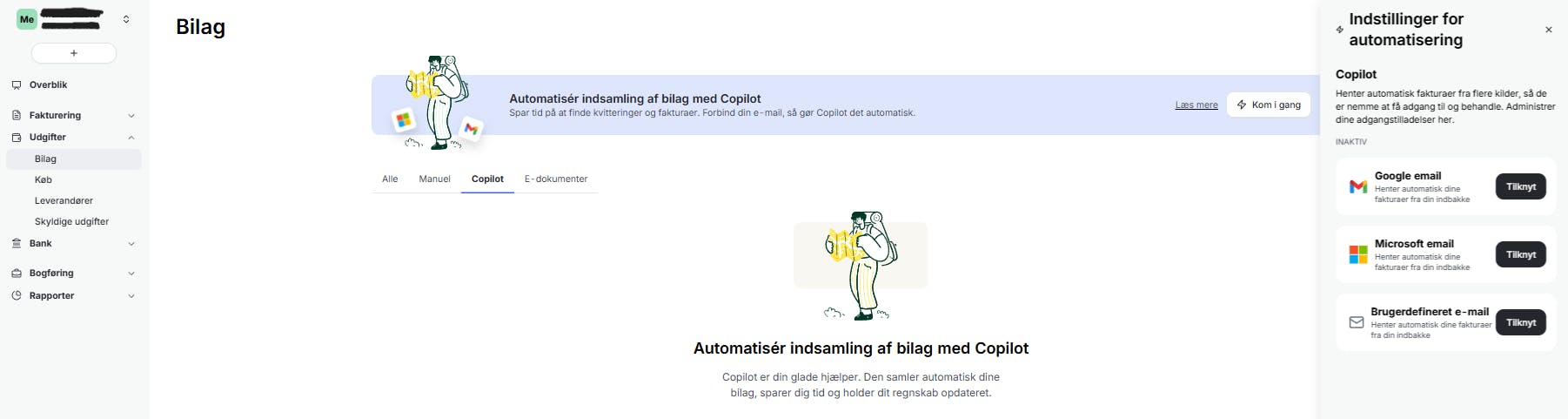 Copilot er en ny funktion i Billy, der automatisk finder kvitteringer i din e-mail-indbakke og importerer dem direkte til Upload-siden. Det betyder, at du slipper for manuelt at uploade kvitteringer – Copilot gør det for dig.