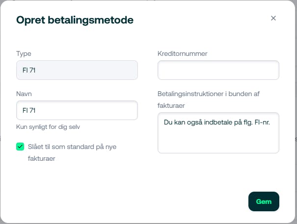 Hvis du bruger FI-kort i din forretning, så kan du også tilvælge det som en betalingsmetode på dine fakturaer i Billy. Dette gør du gennem vores fakturaindstillinger, hvor du kan indtaste dit kreditornummer.