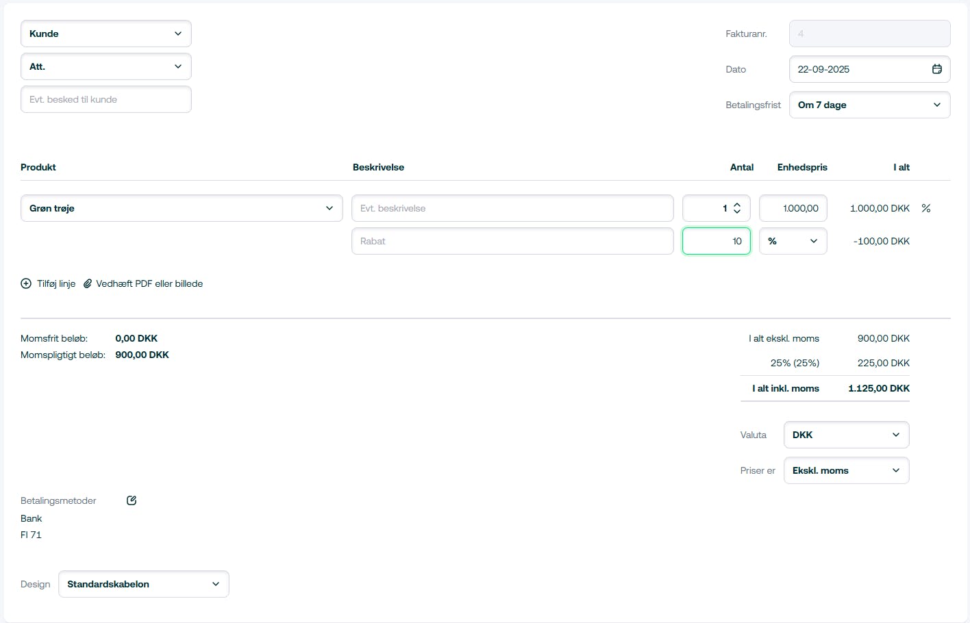 I Billy har du mulighed for at angive rabatter i procent eller i kroner når du sender en faktura til din kunde. Denne artikel viser dig hvordan du tilføjer en rabatsats på en faktura.