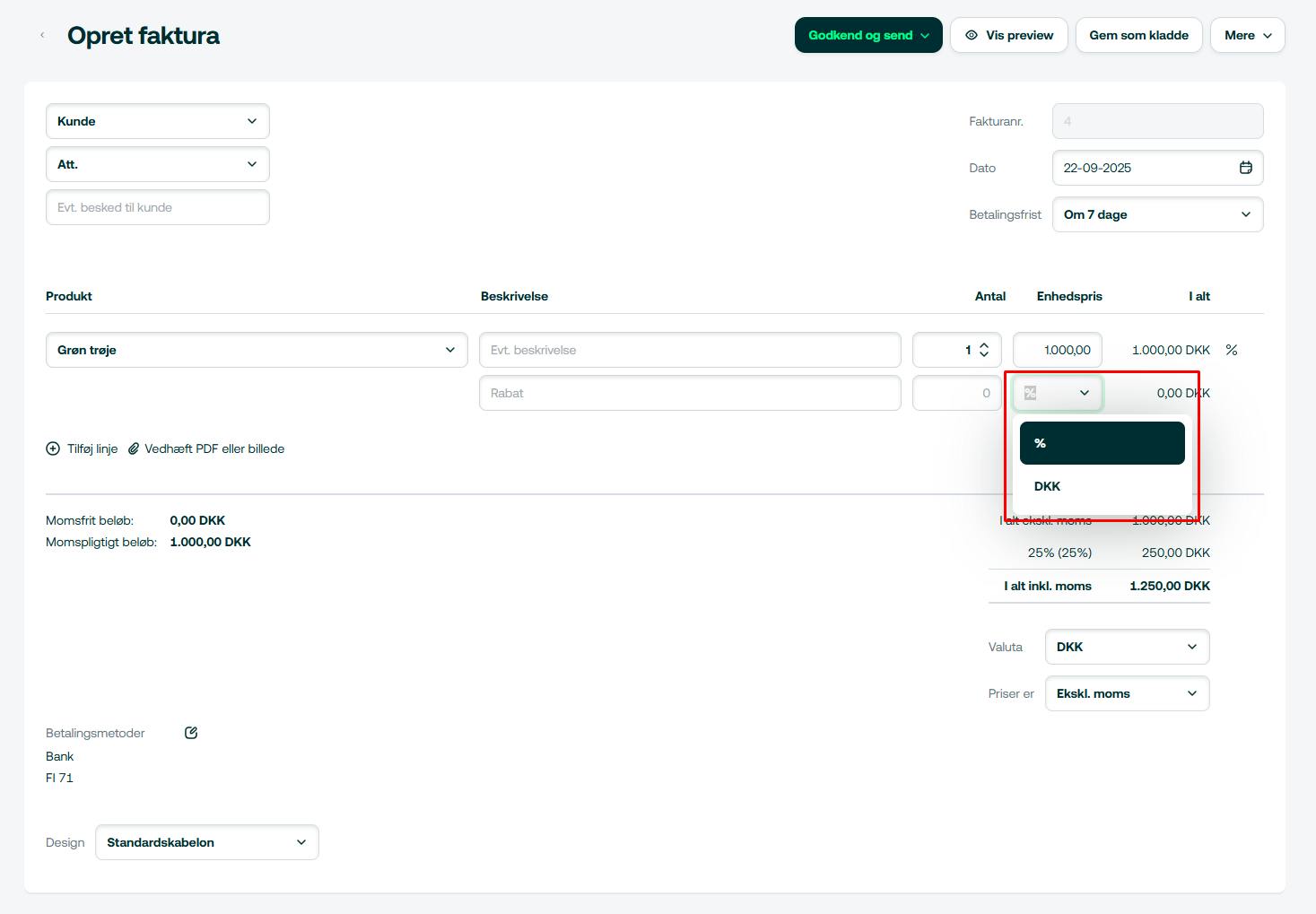 - Vælg om du vil give rabatten i en prosent sats eller i kroner.
