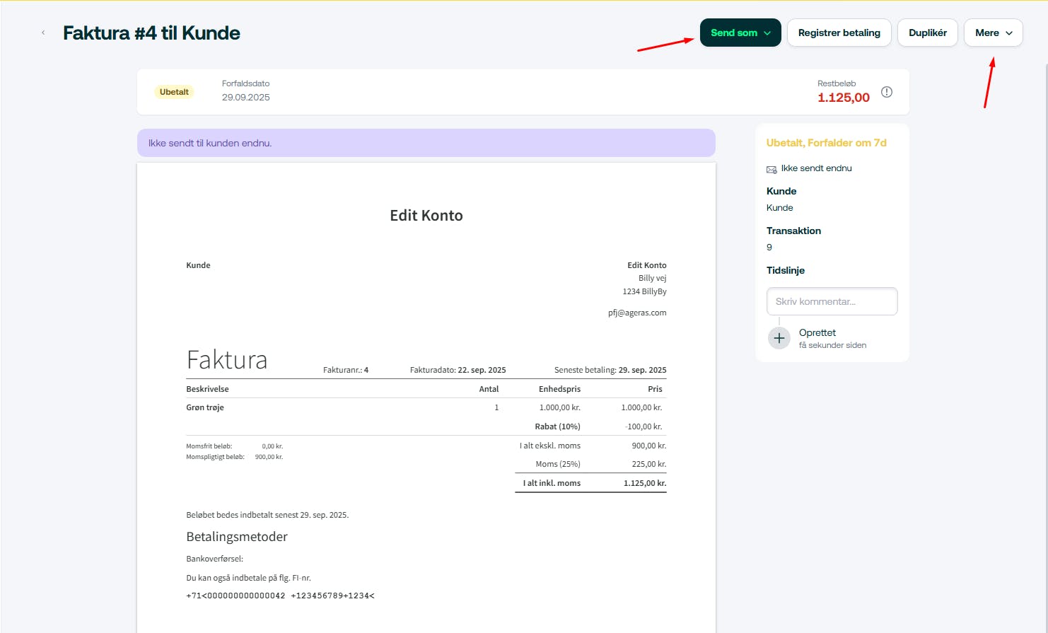 - Vælg til sidst om du vil sende fakturaen som e-mail, udskrive som PDF eller markér som sendt.