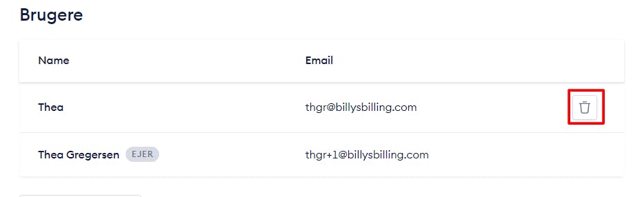 Du kan altid fjerne personer fra at have adgang til dit regnskab. Det gør du ved at holde musen over brugere og klikke på skraldespanden. Så fjerner du deres adgang til dit regnskab. Du kan altid give dem adgang igen på et senere tidspunkt.