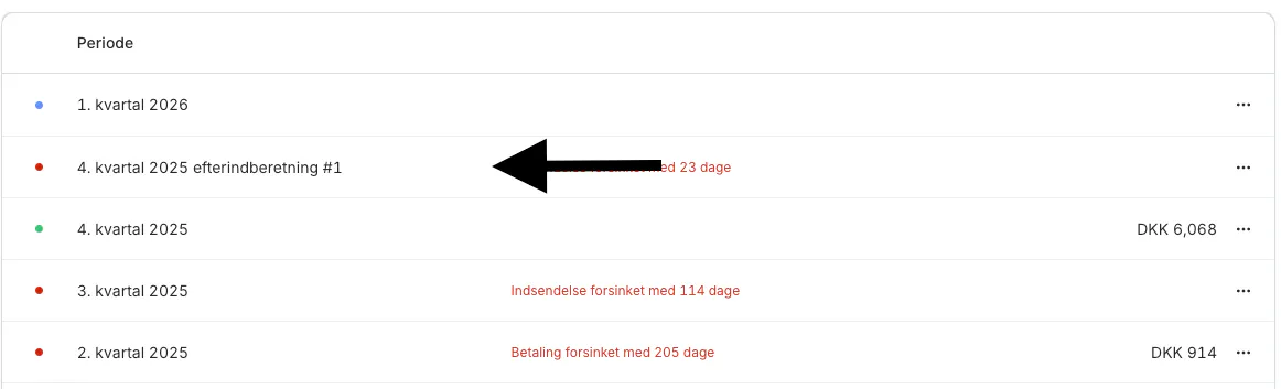 Her kan du se alle dine momsindberetninger til SKAT, og det er netop her at du skal vælge den bestemte periode der skal rettes. Det gør du ved at vælge Ret indberetning i den relevante periode.