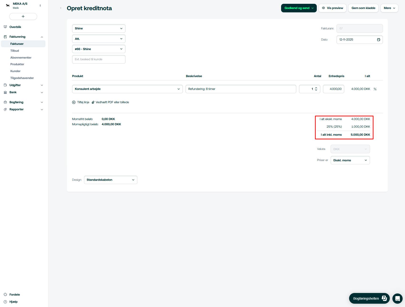 Det er også muligt at refundere en del af beløbet retur til kunden – her ændres beløbet under Enhedspris. Hvis vi antager, at der skal refunderes 30 kr + 7,5 kr. moms, nedskrives den oprindelige faktura på 5000 kr., som vist på billedet nedenfor: