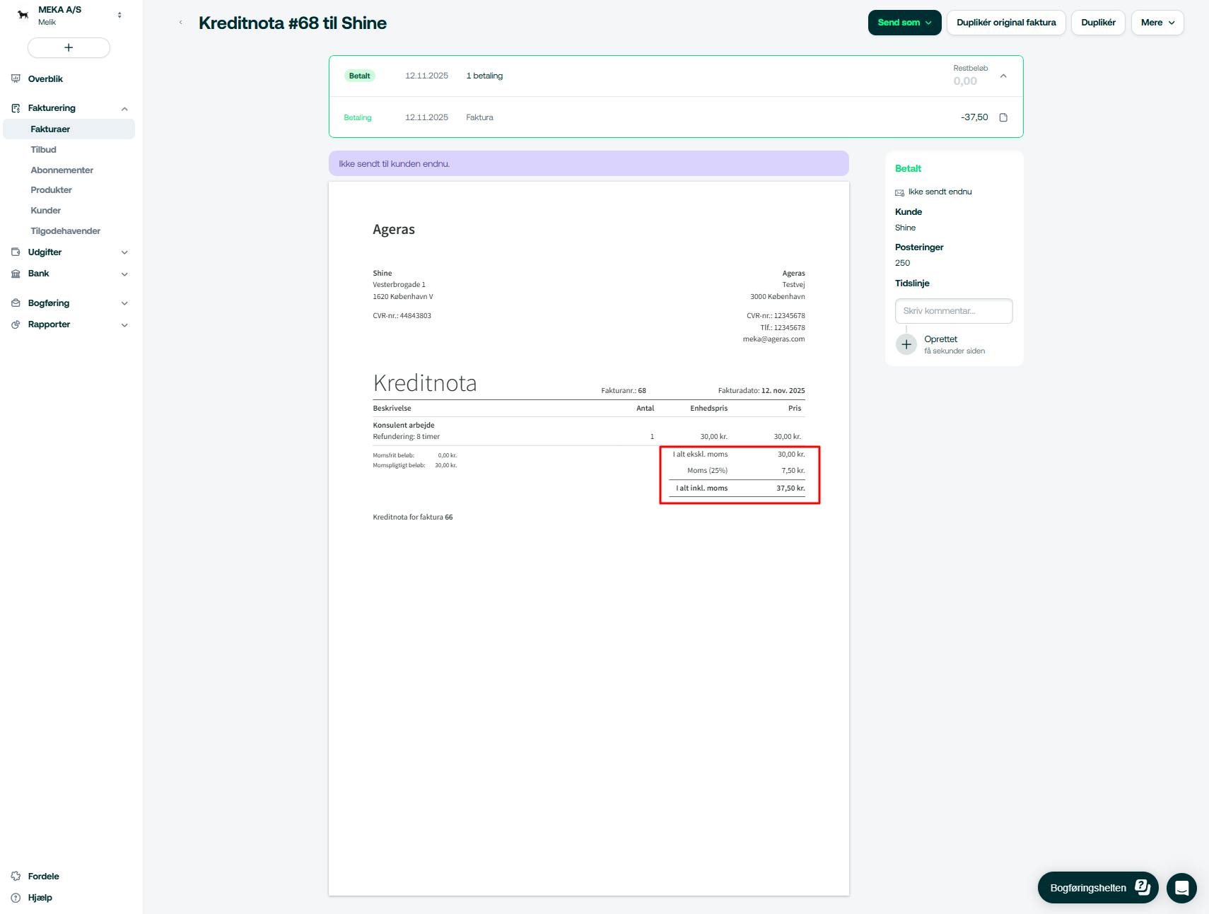 - Tryk på Opret kreditnota for regning