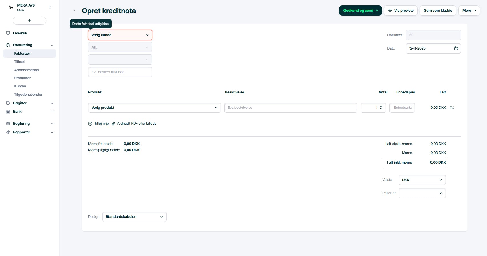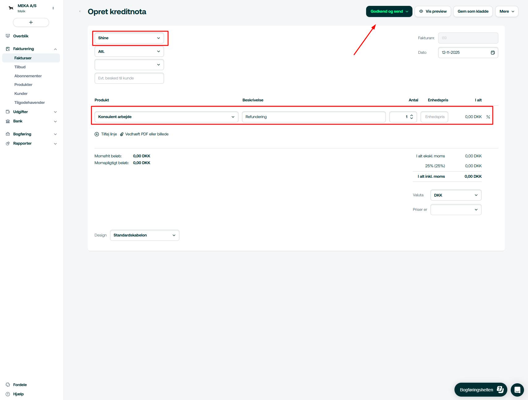 Kreditnotaen udfyldes og godkendes efterfølgende.