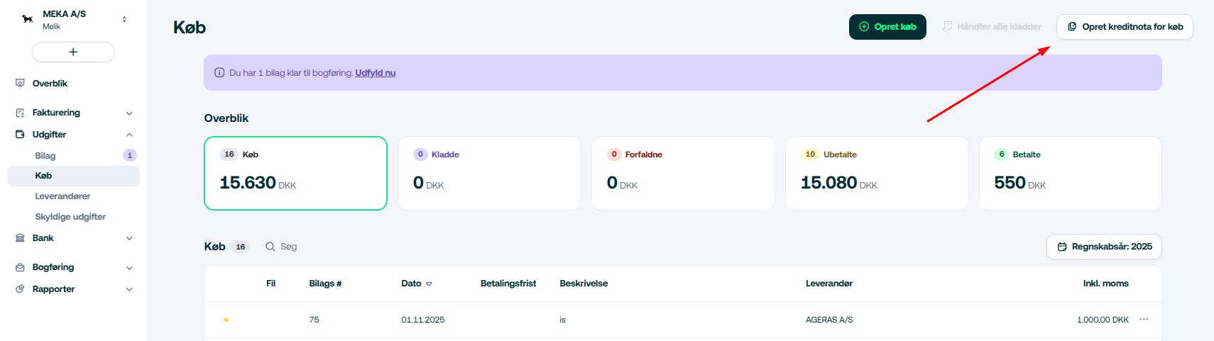 Hvis du opdager en fejl på en regning inden, at du betaler for udgiften, skal du bede din leverandør om en kreditnota. Når du modtager kreditnotaen, skal du finde det specifikke køb frem og oprette en kreditnota direkte på den.