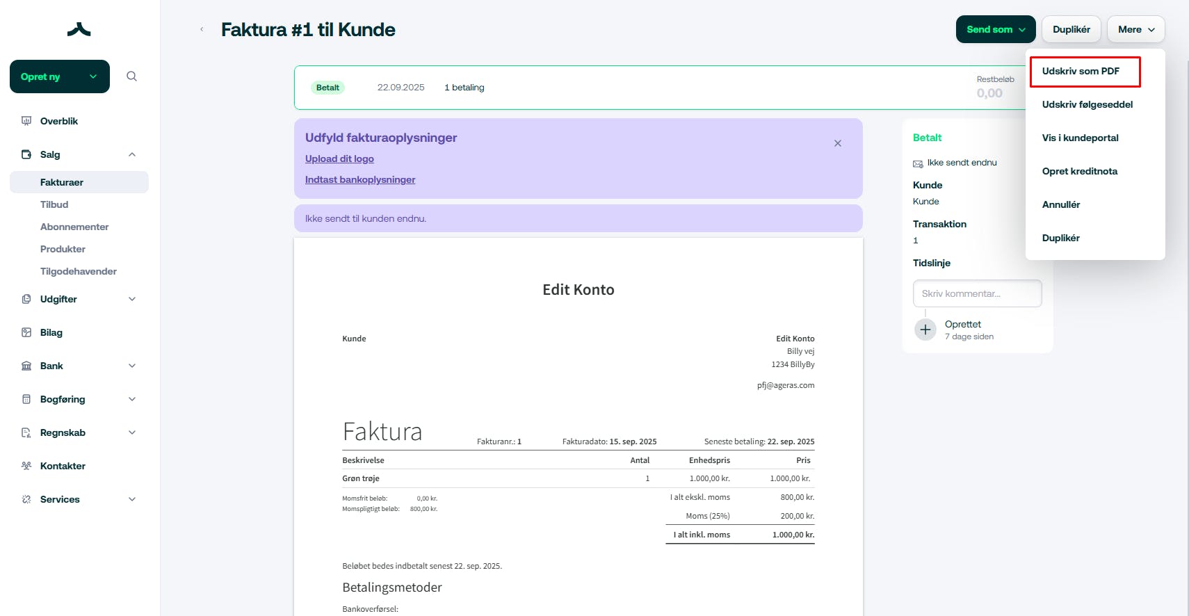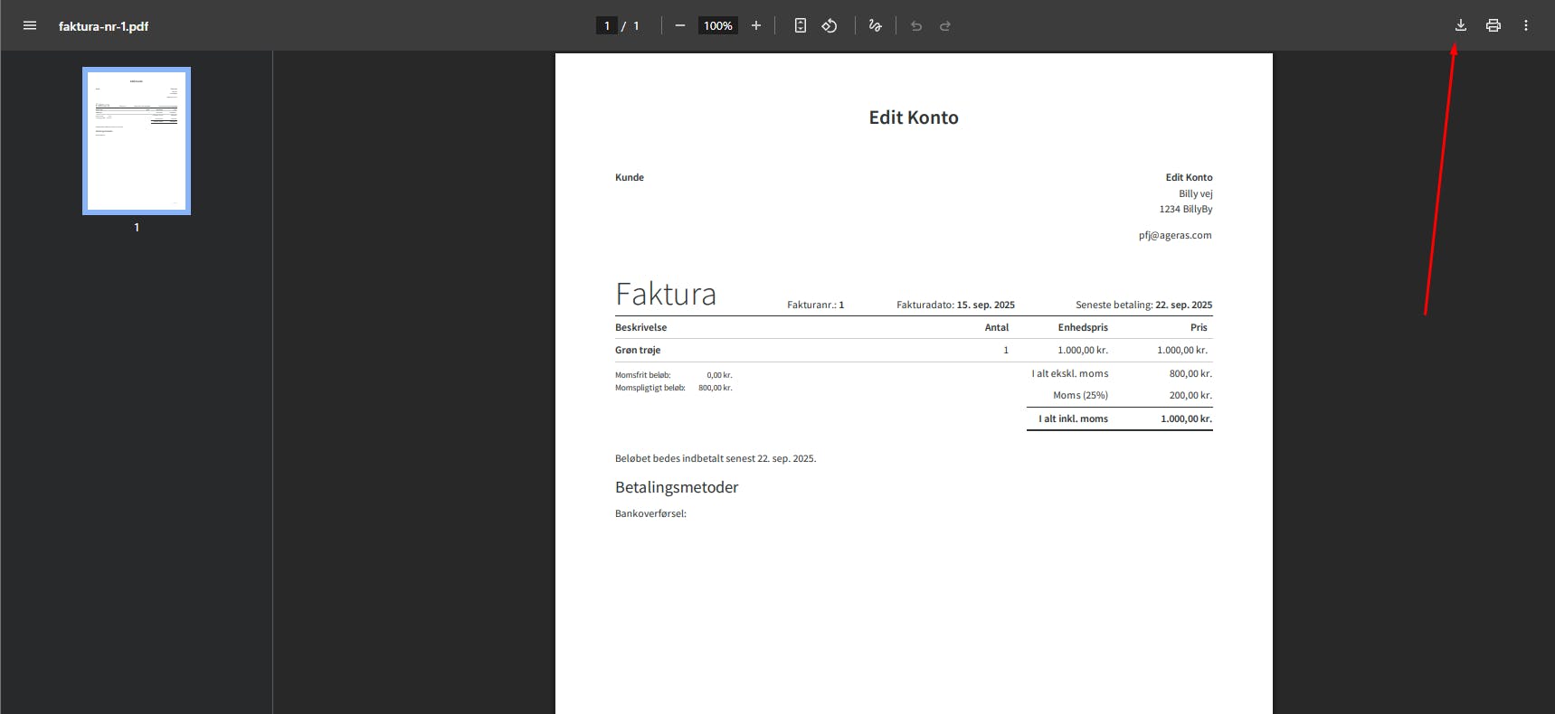 Nu vil fakturaen komme frem, og her kan du downloade den som en PDF-fil.